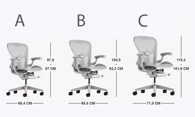 Aeron выпускается в трёх размерах — A, B и C, что позволяет подобрать модель, идеально подходящую под ваш рост и вес. Такой индивидуальный подбор означает, что кресло поддерживает тело правильно, без лишнего давления или провалов, помогая избежать хронических болей и усталости.